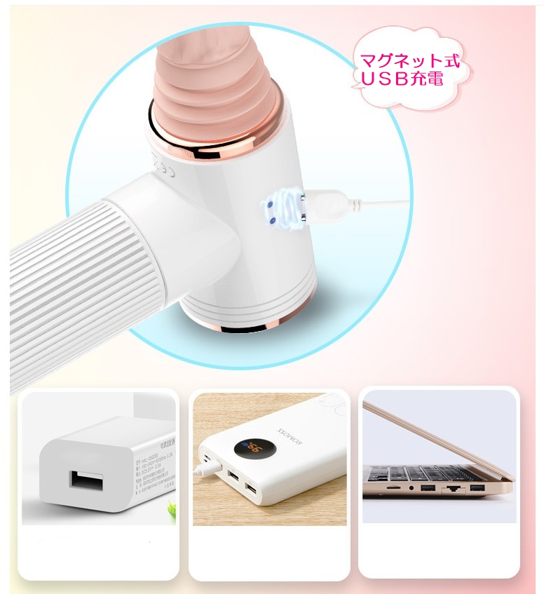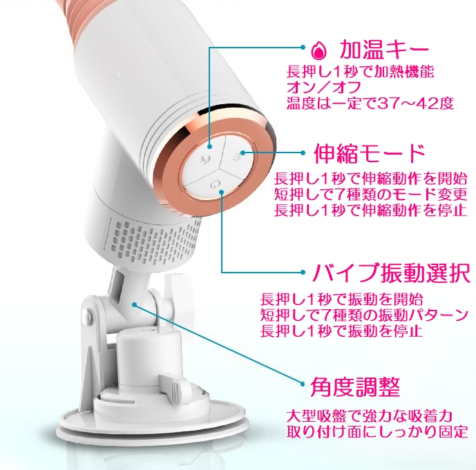 ピストンマシーン金狼 New typeは、とても扱いやすく機能も充実したピストンマシーンになります。まずピストン方向を好きな角度に変えることができます。又、強力吸盤は床や壁に張り付けて使用が可能です。ピストン騎乗位や立ちバックなど、お好きな体制で挿入ができます。そして伸縮パターンが7種類の中から選べれるので、ピストン運動をランダムに刻むことが可能です。伸縮幅は約4cmと十分な挿入深度があり、連射スピードも申し分ありません。さらにバイブ振動機能がついており、7種類の振動モードを選択できます。ピストン運動にバイブ振動がプラス。W刺激であっと言う間に昇天です。挿入しながらディルド全体が震えるのでめちゃくちゃ感じます。そしてまだまだ嬉しい機能があります。それは加温機能です。文字通り人肌にディルドを温めてくれます。冬場の寒い時期でも心地よくオナニーが可能です。温まることで肉棒の生感覚がUPします。女性に大人気の機能が付いた商品です。作動音ですが静かなので夜中でも安心して使用ができます。そして完全防水なので清潔にお手入れもできます。バイブも本体から着脱ができるので、コンパクトに収納が可能です。どなたにでも扱いやすく多機能なピストンマシーンと言えます。